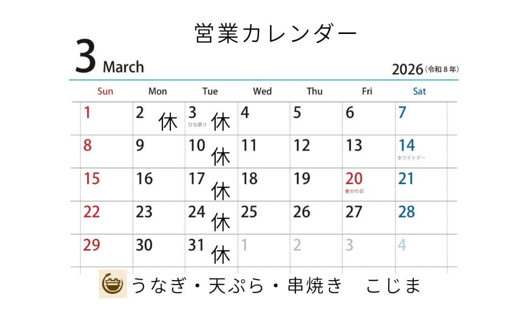 2026年3月の営業スケジュールをお知らせいたします。