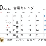 2025年10月2日 / 最終更新日 : 2025年10月2日 fl_admin お知らせ 10月の営業カレンダーのお知らせ 厳しい残暑が和らぎ、心地よい風に秋の訪れを感じる日もあります。 「食欲の秋」と言われるこの時期、 こじまでは、秋の味覚を心ゆくまでお楽しみいただけるよう、こだわりの逸品をご用意しております。 さて、お待たせしました! 1 […]